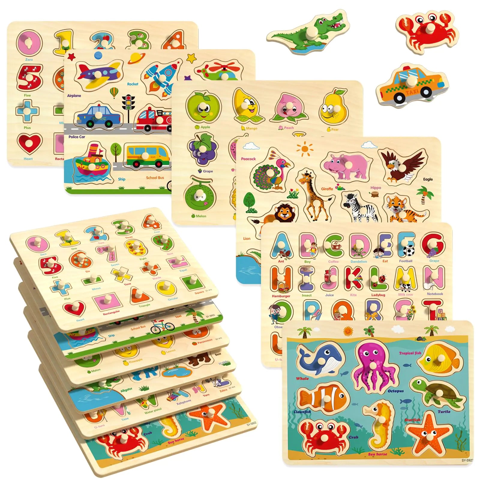 Enhance your toddler’s cognitive development with this 6-Pack Montessori Wooden Peg Puzzle Set, designed for ages 1-4. Each puzzle features colorful and engaging images of the alphabet, numbers, fruits, animals, vehicles, and shapes, making early learning fun while improving hand-eye coordination and attention span.