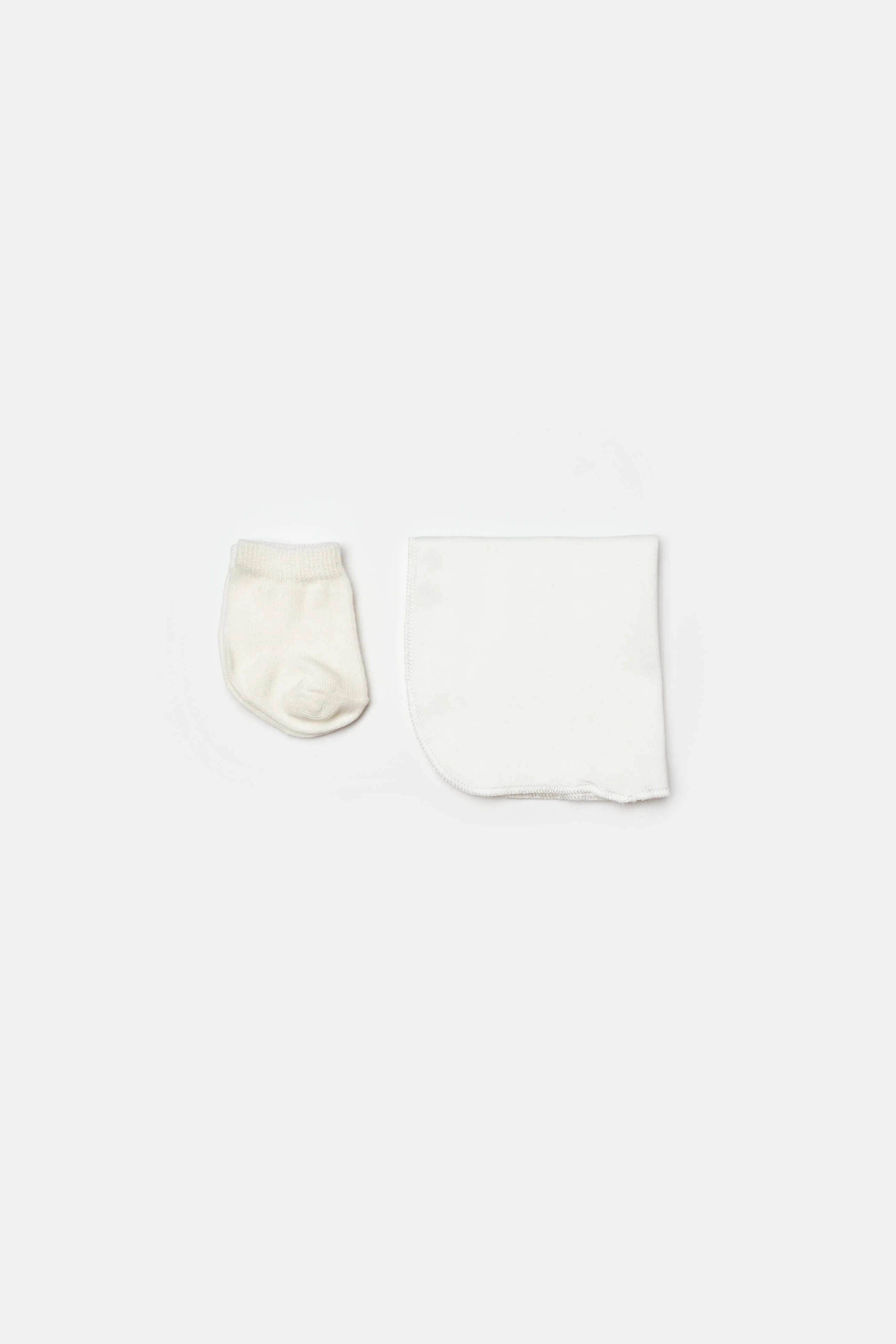 Set contents: Overalls , Bodysuit, Bodysuit, Single bottom with booties, Beanie, Gloves, Apron, Blanket, Socks, Shoulder Cloth