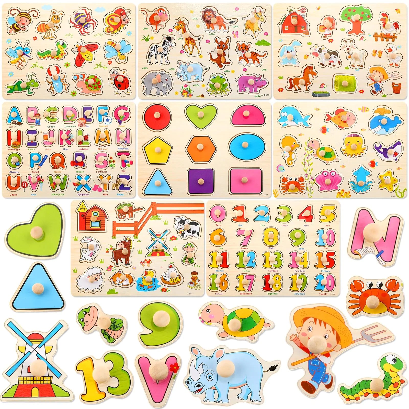 Boost your child’s cognitive development with this 8-set collection of Montessori-inspired brain-boosting wooden peg puzzles, perfect for children ages 6 and above. Each puzzle features alphabet letters, numbers, animals, or vehicles, making learning fun and engaging while strengthening early cognitive skills.